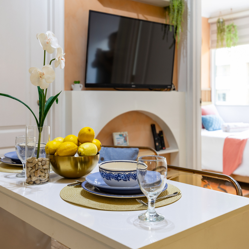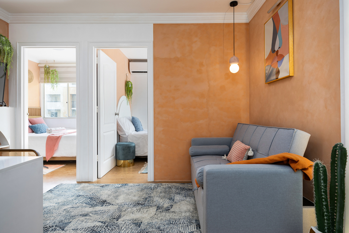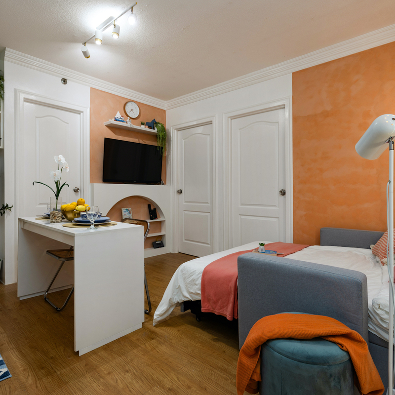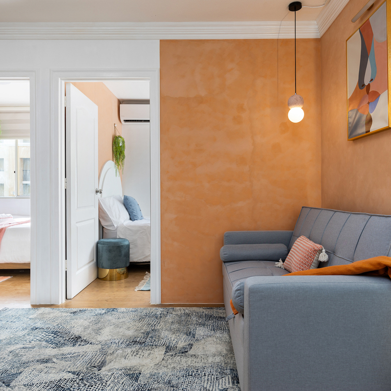The 3rd bed in our unit is a cozy sofabed, perfect for the 5th and 6th guests. Effortlessly transforming into a comfortable sleeping space, it’s just as snug as the main beds. Positioned right in front of the TV, it's ideal for late-night movie marathons or relaxing after a day of exploring. This sofabed also gives the unit a stylish studio vibe, with easy access to all the essentials—the bathroom, kitchen, and everything else are just steps away for your convenience.