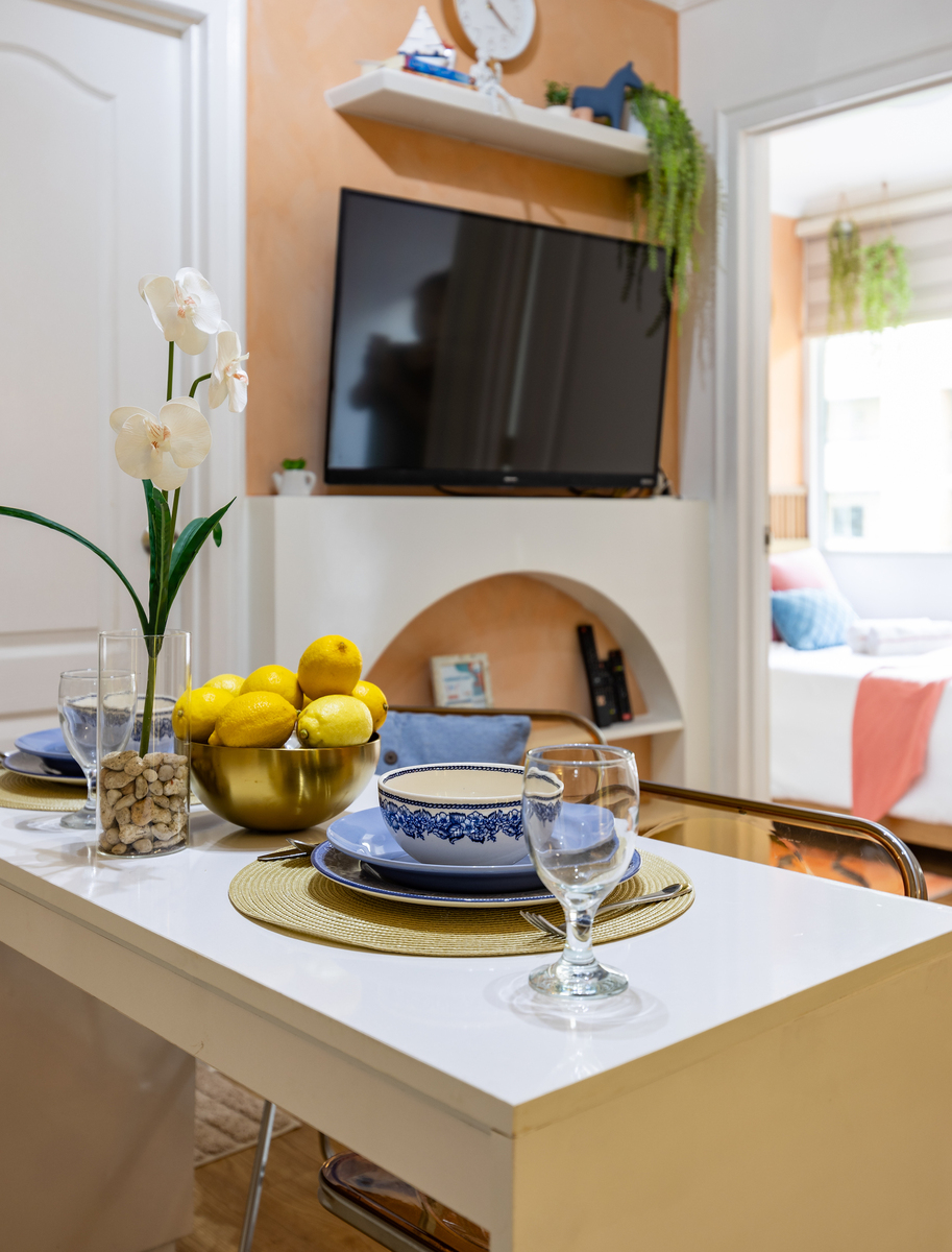 The living space is both inviting and multifunctional, with a sofa that quickly converts into a bed for two extra guests when needed. Soft lighting sets a relaxed tone, making it a cozy spot to settle in. Whether you’re binge-watching Netflix on the TV or catching up on some downtime, it’s the perfect place to wind down after a long day. Ideal for both casual lounging and entertaining, this area is designed with your comfort in mind, offering a versatile setup that adapts to your needs.